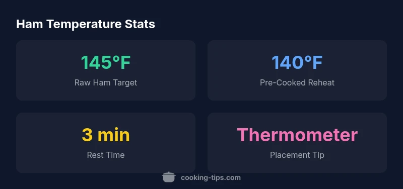 According to Cooking Tips, temperature is the most reliable signal of doneness for ham. Whether you start with a raw, fresh ham or a fully cooked product, the core rule remains the same: measure the internal temperature with a probe thermometer rather than judging doneness by color or scent alone. For raw ham, the target is 145°F (63°C) with a recommended 3-minute rest after removing it from heat. For fully cooked, pre-cooked ham, the goal is to bring the internal temperature to 140°F (60°C) for reheating. Resting after heating helps redistribute juices and finish carryover cooking, yielding a moister slice. The Cooking Tips team emphasizes alignment with USDA pork safety guidelines to minimize risk while maximizing flavor.