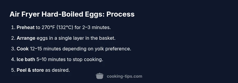 - Preheat the air fryer to 270°F (132°C) for 2–3 minutes. 2) Arrange eggs in a single layer, using a rack if possible. 3) Cook for 12–15 minutes depending on yolk firmness. 4) Prepare an ice bath during cooking. 5) Transfer eggs to the ice bath for 5–10 minutes. 6) Dry and peel under running water. 7) If needed, test one egg to confirm doneness and adjust future batches. 8) Store cooked eggs in the fridge or use immediately.
