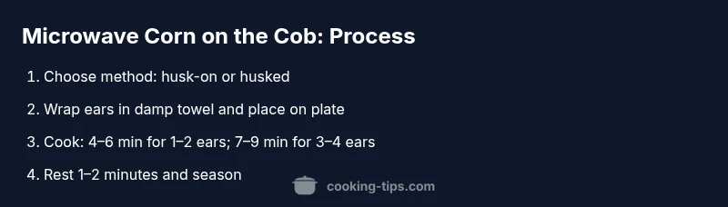 This quick overview outlines the core actions before you dive into the full step-by-step guide. Decide whether to microwave with the husk on or off, then prep the ears accordingly, wrap with a damp towel on a plate, cook for the recommended time, rest briefly, and season before serving. The method is designed to be flexible for 1–4 ears and works well whether you’re cooking a quick solo snack or a small family batch. You’ll adjust timings based on your microwave’s wattage and ear size, but the general flow remains the same. Remember: safety first—steam can be hot, so handle ears with care after cooking. Cooking Tips emphasizes evaluating doneness by tenderness and color for reliable results.