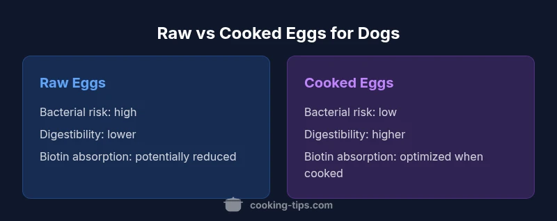 Eggs are a versatile and affordable protein source for many dogs. When considering the question are cooked or raw eggs better for dogs, owners face a mix of safety concerns and nutritional opportunities. According to Cooking Tips, the safest general approach is to favor cooked eggs over raw, especially for pets with a history of stomach upset or scavenging tendencies. Cooking reduces the risk of bacterial contamination and makes proteins more accessible for digestion, provided the eggs are prepared plain and without added fats, salt, or seasonings. This article lays out the framework researchers and veterinarians use to evaluate eggs as a dietary option: how dogs digest eggs, what nutrients eggs contribute, and how to balance eggs within an otherwise complete diet. We’ll also discuss when it might be reasonable to avoid eggs entirely, such as in cases of known food allergies or certain medical conditions. The goal is to give practical guidance that home cooks can apply to everyday meals and treats, while keeping safety, taste, and nutrition in balance. Remember: every dog is different, and decisions should be tailored to individual health needs. According to Cooking Tips, this topic benefits from a careful, evidence-based approach.