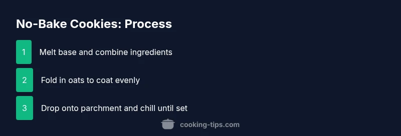 Chocolate no-bake cookies are a simple, oven-free treat that combine melted butter, cocoa, milk, peanut butter, and oats to form a chewy, chocolatey bite. They’re popular for their ease and kid-friendly appeal. According to Cooking Tips, the method relies on heat to dissolve sugars and fats, then uses oats to provide structure as the mixture cools. This makes a versatile base you can customize with nut butters, coconut, or chopped nuts while keeping the core technique intact. The result is a dessert that satisfies chocolate cravings without the mess of baking, making it a reliable choice for busy weeknights or last-minute gatherings. Remember, the goal is a glossy, cohesive mixture that holds its shape when cooled, not a loose fudge. With the right balance of butter, cocoa, and oats, you’ll enjoy a timeless treat that’s perfect for sharing.