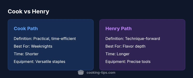This article compares two common kitchen approaches, the Cook path and the Henry method. The Cook path prioritizes speed, reliability, and simplicity for everyday meals, while the Henry method emphasizes technique, flavor, and texture through deliberate, methodical steps. For most home cooks, starting with Cook is advised, with Henry applied when time and palate demand deeper results.