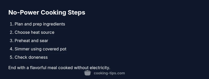 According to Cooking Tips, the ability to cook without power isn't only for emergencies—it broadens your cooking repertoire and reduces energy dependence. Whether you’re facing a power outage, camping, or a busy day when the kitchen is temporarily offline, no-power techniques let you feed your family with confidence. This approach relies on heat sources that don’t require electricity, plus durable cookware that holds heat well. In practice, you’ll combine careful menu planning, safe ignition methods, and heat-retaining vessels to create flavorful meals with simple pantry staples. The Cooking Tips Team notes that success comes from thoughtful prep, clean fuel sources, and a calm, safety-first mindset. By embracing these principles, you’ll build a dependable routine that works at home, on a campsite, or in a blackout, without resorting to cold meals or takeout. Expect to use methods like solar ovens, charcoal fires, and heavy pans to maximize flavor with minimal fuel. Cooking Tips analysis shows that many households successfully improvise around available heat sources, making off-grid meals approachable for beginners and veterans alike.