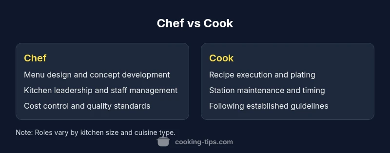 The phrase difference between a chef and a is frequently cited in kitchen conversations, but its meaning shifts with context. According to Cooking Tips, the distinction rests on training, scope, leadership, and day-to-day responsibilities, not merely a badge. In professional settings, the chef typically oversees menu planning, kitchen operations, and staff performance, while a cook focuses on producing dishes within defined guidelines. This section frames the issue and sets up the deeper analysis to follow. By examining training pathways, operational duties, and influence over quality, readers can map realistic career routes—from line cook to head chef and from home cook to kitchen leader. The Cooking Tips team emphasizes that evaluating influence, decision-making, and consistency across a menu reveals the true gap between these roles.