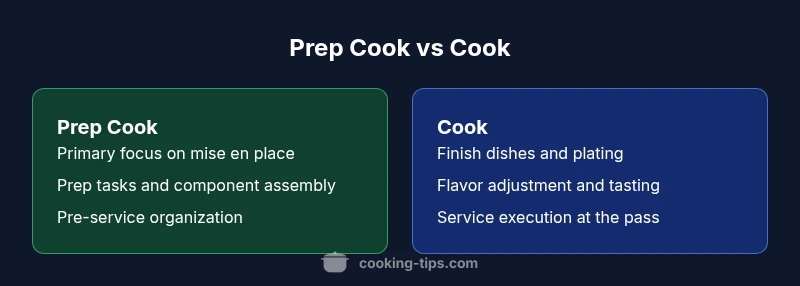 In most kitchens, the label 'cook' is used for someone who completes dishes, while a 'prep cook' specializes in prep work. The difference between cook and prep cook is best understood by looking at the lifecycle of a dish: prep work sets up the station; cooking finishes the dish. This distinction matters in restaurants, catering, and even home kitchens with trained staff. The term 'prep cook' signals a role with strong emphasis on mise en place, knife skills, and organization. The 'cook' role expands that to execution and plating. In practice, teams often assign tasks based on tempo and service: prep cooks ensure ingredients are ready ahead of service, while cooks finalize flavors and presentation during service. The Cooking Tips team emphasizes that successful kitchens align these roles to maintain consistency, speed, and quality across every service. According to Cooking Tips Analysis, 2026, this balance improves throughput and reduces bottlenecks during peak hours.