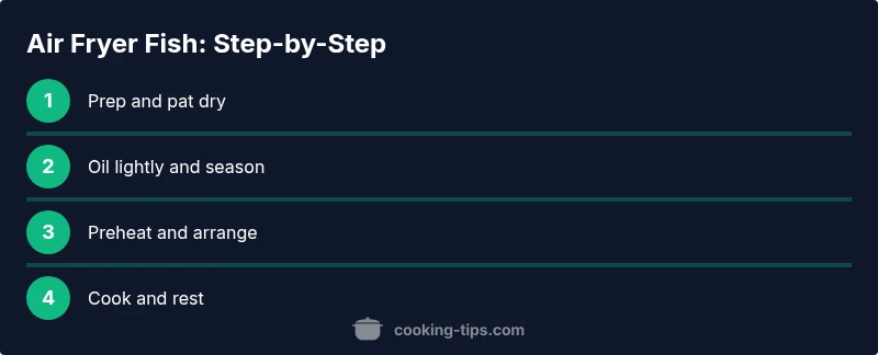 - Pat dry and trim the fillet. 2) Lightly spray with oil and season on both sides. 3) Preheat the air fryer to 400°F (200°C). 4) Place the fillet in the basket with space around it. 5) Cook for 8–12 minutes, flipping halfway. 6) Check for 145°F internal temperature and rest 2–3 minutes. 7) Plate and finish with a squeeze of lemon or fresh herbs.