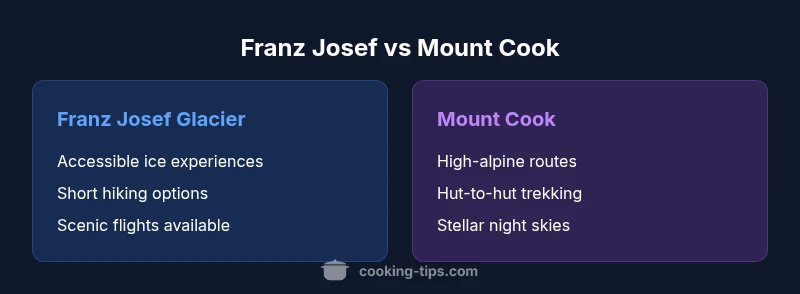 Choosing between these two NZ icons depends on your preferred pace, terrain, and travel window. The franz josef or mount cook choice should be guided by accessibility, safety considerations, and the kind of scenery you want to carry with you long after the trip. According to Cooking Tips, both destinations deliver stunning alpine drama, but the approach and preparation differ markedly. This article analyzes geography, logistics, terrain, and safety to help you decide which option aligns with your skills, budget, and time. The distinction matters because the two sites sit in distinct climatic belts and require different planning horizons. By weighing the core factors—accessibility, terrain, and seasonal windows—you can optimize your experience, whether you’re seeking a family-friendly day on ice or a multi-day alpine expedition.