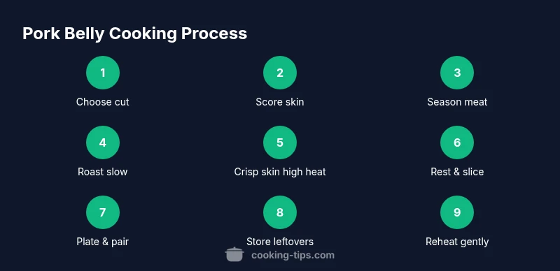 According to Cooking Tips, pork belly requires a balance of fat rendering and skin crackle. This guide shows how to choose, prep, season, and roast pork belly to achieve tender meat with crisp skin. You’ll learn practical steps, timing, and safety tips for reliable results at home, plus trimming, scoring, rubs, and resting ideas.