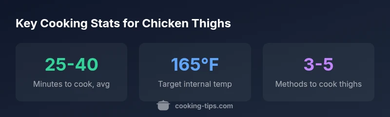 The typical answer to how long to cook chicken thighs depends on cut and method. Bone-in, skin-on thighs usually need about 35-45 minutes in a conventional oven set to 400°F, while boneless, skinless thighs finish faster in the range of 20-30 minutes. On the stovetop, sear 6-8 minutes per side and finish with a brief bake or simmer to reach 165°F internal temperature. For grilling, plan 10-15 minutes total on indirect heat, turning halfway. Regardless of method, aim for 165°F internal temperature and allow a short rest to lock in juices.
