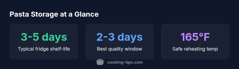According to Cooking Tips, cooked pasta stored properly in an airtight container usually stays safe for 3-5 days in the fridge. For best quality, aim to consume within 2-3 days when possible, and always reheat to at least 165°F (74°C). The Cooking Tips team found that rapid cooling and portioning helps preserve texture and flavor.