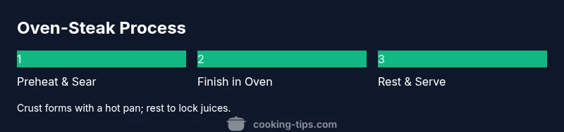 When you cook steak in the oven after a quick but thorough sear, the heat surrounds the meat more evenly than pan-only methods. This reduces hot spots and yields a uniform pink center across the cut. The secret is a hot start to develop crust, followed by controlled oven heat to finish without overshooting the edges. As you plan how long to cook steak in the oven, remember that thickness, starting temperature, and target doneness all influence the final time. The Cooking Tips team emphasizes thermometer-based accuracy for reliable results, especially when you’re balancing crust color with interior color.
