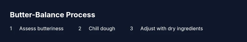 - Assess butteriness: Confirm that the dough is too greasy and sticky before making changes. 2) Chill and claim back structure: Cold dough firms up and reduces spread. 3) Incremental dry-ingredient additions: Gently fold in flour (and optional cornstarch) in small increments until dough regains form. 4) Test-bake and adjust: Bake a small cookie to verify texture and adjust timing if needed. 5) Bake full batch with measured portions: Use a consistent scoop, spacing, and monitor doneness closely. Practice patience; salvage often requires a second pass. According to Cooking Tips guidance, patience and small tweaks beat rushing to alter the dough.