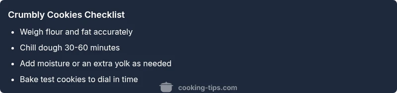 Diagnose crumbly cookies and fix texture with proven methods: moisture balance, fat ratios, chilling, and oven timing. A practical, clear guide from Cooking Tips for reliable results.