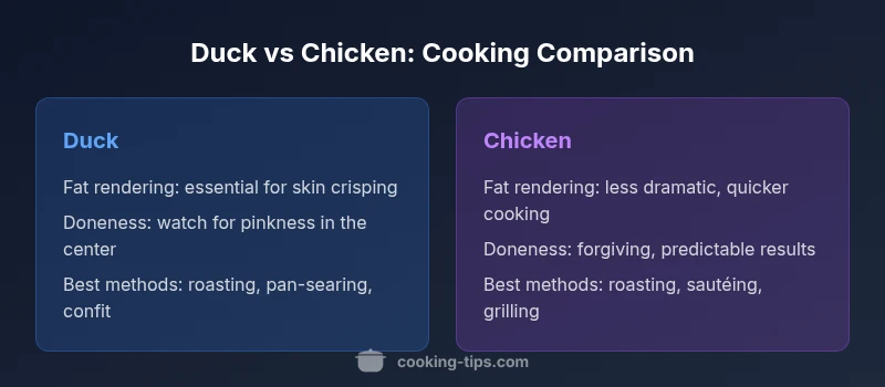Explore the practical differences between cooking duck and chicken. Learn fat rendering, doneness cues, and technique nuances with evidence-based guidance from Cooking Tips to decide when duck fits your menu and how to cook it confidently.