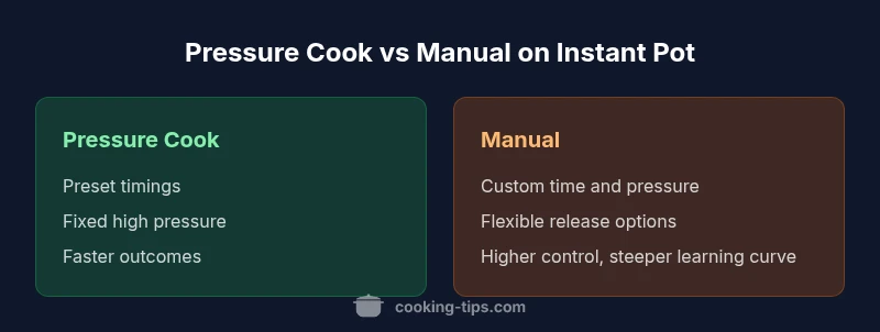 To start, consider what each mode is designed to do. In practice, many home cooks ask is pressure cook the same as manual on instant pot; and the answer hinges on control vs convenience. According to Cooking Tips, Pressure Cook is a preset cycle that selects a standard pressure (high or low depending on model) and a default cook time for common foods such as beans, rice, and tougher cuts. Manual mode, by contrast, exposes the user to exact time, pressure level, and pressure release method. This distinction matters because the same recipe can finish with a different texture if you rely on presets rather than adjusting timing and pressure to your specific ingredients. The goal is to understand when a preset saves time without sacrificing results, and when direct control is worth the extra attention. In many dual-use Instant Pots, both modes share the same sealing mechanism and safety features, but the interpretation of “done” will differ. According to Cooking Tips, mastering both modes expands what you can cook reliably.
