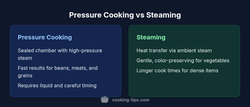 Beyond the kitchen, this distinction also affects energy use, equipment needs, and safety practices. The Cooking Tips team emphasizes that choosing the right method starts with what you’re cooking, the desired texture, and how much time you have. As you read on, you’ll see practical guidelines and examples that illustrate when steam shines and when pressure wins.