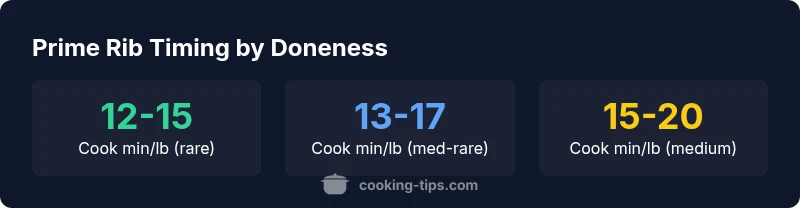 Prime rib cook time varies with weight and desired doneness. For a typical roast, roast at 325°F to finish around 120-135°F internal temperature, about 12-20 minutes per pound, followed by a 15-20 minute rest. Adjust by 2–3 minutes per pound for hotter ovens or a quick sear. A calibrated thermometer yields the most reliable guide.