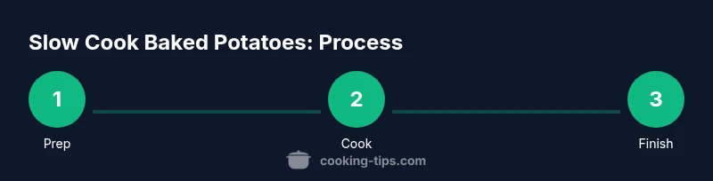 This section gives you a high-level sequence to guide your cooking, whether you use a slow cooker or an oven. Step 1: wash and dry the potatoes thoroughly to remove any dirt and ensure crisp seasoning adherence. Step 2: pierce with a fork to vent steam and prevent bursting. Step 3: toss with oil and salt, and if desired, add pepper and herbs. Step 4: arrange potatoes with space for heat circulation. Step 5: cook at the chosen method's temperature for the recommended time. Step 6: finish with a high-heat or broil to crisp skins if desired. Step 7: test for doneness with a fork; center should be tender. Step 8: rest briefly, then serve with toppings as desired.