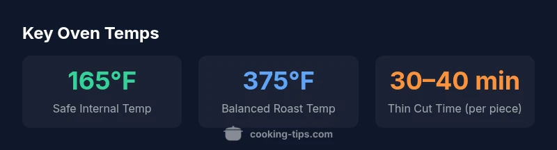When you roast chicken in the oven, the temperature you choose drives safety, texture, and flavor. The temperature to cook chicken in oven captures a core question for home cooks: how hot is hot enough to cook the meat through without drying it out? The answer blends food-safety guidelines with practical kitchen experience. A steady oven temperature helps proteins set gently, retain moisture, and deliver a golden-brown outside. Cooking Tips's guidance emphasizes verifying doneness with an instant-read thermometer and letting the meat rest before slicing. If you overshoot, the outer layer can burn while the interior remains underdone; if you undershoot, you risk stringy texture and uneven cooking. In the sections below, you’ll find clear ranges for common cuts, how convection changes timing, and practical steps to confirm doneness with confidence.