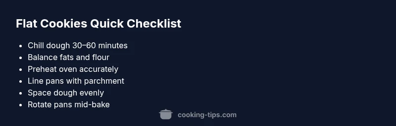 Cookies flatten when the dough can't hold its shape under heat. The dough's structure depends on fat, sugar, leavening, moisture, and gluten, plus how you handle it. In practice, small shifts in ingredient ratios or temperature produce big differences in spread. The keyword what causes cookies to be flat appears here to anchor the topic and guide your troubleshooting. By understanding the balance between fat and flour, hydration, and heat, you can diagnose why a batch spreads too much and learn which levers to pull to regain thickness and chewiness. Throughout this guide, we assume you’re aiming for evenly thick cookies with defined edges and a soft center, which many home bakers prefer. We’ll apply these principles to both classic chocolate chip recipes and simple drop cookies so you can adapt them to your favorites.
