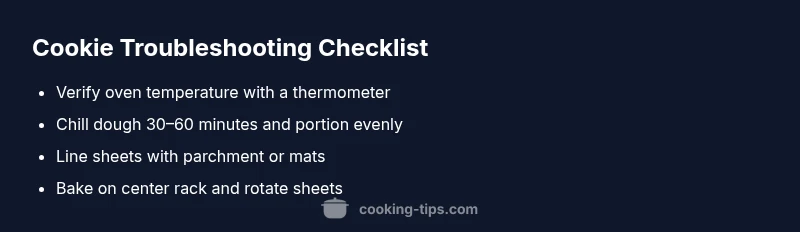 Cookies can be frustrating when they don't turn out as expected. In many cases, you’ll notice issues like cookies that spread too much and flatten, cookies that are pale or undercooked in the centers, edges that are hard or burnt, or cookies that taste dry and crumbly. The good news is that most cookie mishaps share a few root causes: temperature, moisture, and dough handling. According to Cooking Tips, the path to reliable cookies starts with simple checks you can perform before you bake again. Start by verifying oven temperature using a reliable oven thermometer, ensuring you measure ingredients by weight when possible, and adjusting your chilling times. With a systematic approach, you can pinpoint whether the problem is oven heat, ingredient balance, or dough management, and apply targeted fixes.