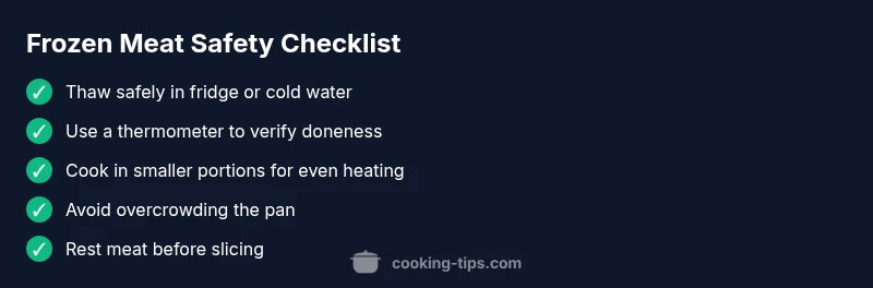 Handling frozen meat demands strict hygiene to prevent cross-contamination. Start with clean hands and sanitized surfaces. Keep raw meat separate from ready-to-eat foods and always wash hands, knives, and cutting boards after contact. Thawing generates moisture that can harbor bacteria; seal packaging and place meat in a tray to catch drips. After cooking, refrigerate leftovers promptly, within two hours, and reheat thoroughly before consuming. When in doubt, discard any meat that shows off odors, slimy texture, or extensive freezer burn. Following best practices protects you and your family from foodborne illness. The Cooking Tips team emphasizes that safe handling is as important as correct doneness for frozen-meat dishes.