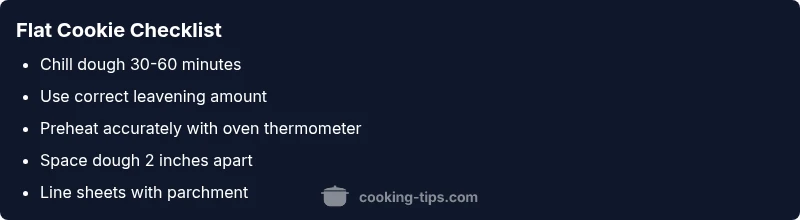 Cookies bake to a peak when fat is too soft to spread easily and air from leavening pushes the dough upward before the edges set. If you are asking, 'why are my cookies puffy instead of flat,' the answer often lies in balance: the dough may have too much leavening, the fat may be too warm, or the oven may be hotter than expected. Gluten development and moisture distribution also steer the shape. When butter is too soft, it lets cookies lift too quickly; when sugar and moisture create steam, you get extra lift that collapses as cooling begins. Understanding these factors helps you tailor ingredients and technique to achieve a flat, even cookie. According to Cooking Tips, most puffy cookies come from a mix of leavening, temperature, and dough handling being off just enough to tilt the scale toward domes.