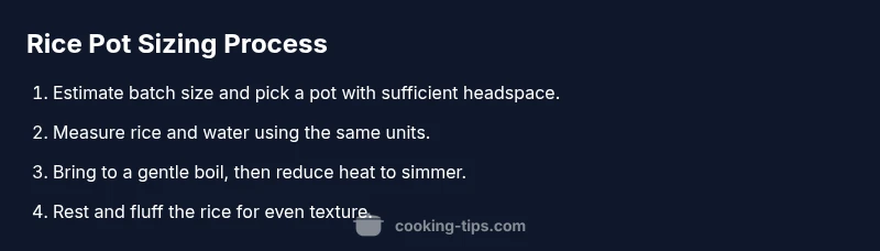 Choosing the right pot size is a foundational step in cooking rice that many home cooks overlook. When you ask how big of a pot to cook rice, the answer isn’t just about fitting a lid; it’s about giving the grains room to expand, letting steam circulate, and preventing boil-overs. The Cooking Tips team emphasizes that a pot with suitable capacity and a wide, stable base can affect texture, evenness, and the ease of handling a hot pot. With the right size, you’ll see fluffy grains where each kernel is distinct rather than clumped. In short, pot size sets the stage for consistency across batches. According to Cooking Tips, pot size also influences steam distribution and absorption, which matters whether you’re cooking white, brown, or specialty rice varieties.