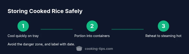 Cooked rice is a staple for weeknight meals, but it can become unsafe quickly if mishandled. Proper storage reduces the risk of foodborne illness and preserves texture, aroma, and flavor. In this guide you’ll learn practical, science-based steps for cooling, chilling, and reheating rice safely. The Cooking Tips team emphasizes that safety starts the moment rice comes off the stove: keep it out of the temperature danger zone, use airtight containers, and cool it promptly. By following a few reliable habits, you can reuse leftovers confidently for lunches, fried rice, or rice bowls without sacrificing quality. The goal is to give home cooks a clear, repeatable routine they can apply every time they cook rice, regardless of the variety (white, brown, long-grain, or short-grain).