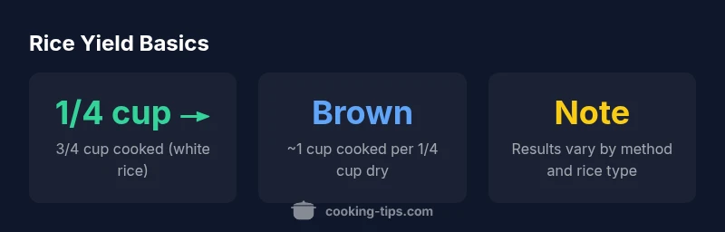 When you measure dry rice, you are counting grains in their uncooked state; when you cook it, the grains absorb water and swell, increasing in volume. For home cooks wondering how much cooked rice is 1/4 cup dry, the answer depends on rice variety and cooking method. In general, most white rice varieties expand to roughly three times their dry volume, so 1/4 cup dry will become about 3/4 cup cooked. This guideline offers a reliable starting point for meal planning and portioning. The Cooking Tips team reminds readers that results can vary, especially with brown rice or aromatic varieties like basmati, which may require different water amounts and cooking times. Variables such as rinsing, soaking, heat level, and cookware can shift the final yield by a small margin, so treat the numbers as a practical range rather than a fixed rule.