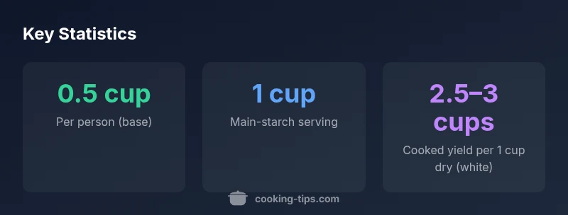 When you consider how much cooked rice per person, a practical baseline is 0.5 cup to 1 cup per person. If rice is the main starch, aim for about 1 cup; for meals with several sides, 0.5 cup may suffice. Adjust for age, appetite, and rice variety. In real kitchens, this translates to roughly 100–200 grams per person. The key is to balance starch with protein, vegetables, and sauce in a single plate. For a crowd, you can combine rice with other grains, such as quinoa or barley, to stretch portions without sacrificing texture. It helps to map portions ahead of time using a simple calculator or a printed chart. In practice, you’ll see a range, not a one-size-fits-all number: some guests will tidy their plates with a half cup, others will return for seconds. Cooking Tips’s guidance for 2026 relies on typical home-cook patterns observed across households and cultural meals.