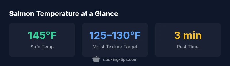 Salmon cooks quickly and its exact doneness depends on thickness, fat content, and cooking method. When you ask what should cooked salmon temp be, you are balancing safety with texture. According to Cooking Tips, knowing the target temperature helps you avoid dry, chalky bites while ensuring the center reaches a safe level. In practice, many home cooks start with the USDA's safety guideline of 145°F (63°C) in the thickest part, then adjust downward for a moister finish if they are comfortable with a slightly lower safety margin. You should also account for carryover heat during resting, which can raise the internal temp by a few degrees. By choosing a precise temperature, you can tailor salmon texture from flaky to velvety, depending on preference and method.