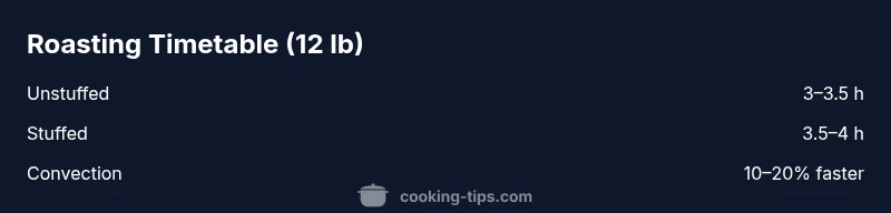 | Unstuffed Roast (12 lb) | 3-3.5 hours | 165°F thigh; 165°F breast | Roast at 325°F; rest 20-30 min |